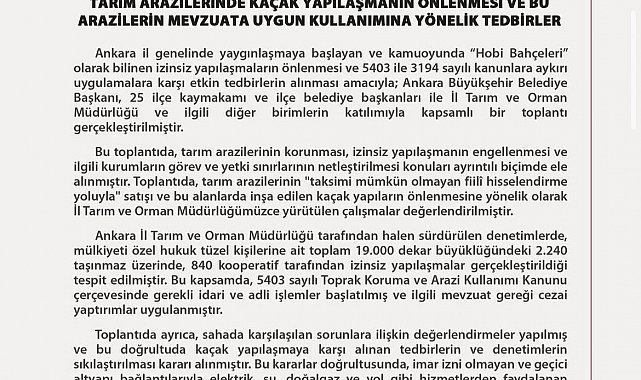 "Ankara Büyükşehir Belediye Başkanı, 25 ilçe kaymakamı ve ilçe belediye başkanları ile İl Tarım ve Orman Müdürlüğü ve ilgili diğer birimlerin katılımıyla kapsamlı bir toplantı gerçekleştirilmiştir. Bu toplantıda, tarım arazilerinin korunması, izinsiz yapılaşmanın engellenmesi ve ilgili kurumların görev ve yetki sınırlarının netleştirilmesi konuları ayrıntılı biçimde ele alınmıştır. Toplantıda, tarım arazilerinin 'taksimi mümkün olmayan fiilî hisselendirme yoluyla' satışı ve bu alanlarda inşa edilen kaçak yapıların önlenmesine yönelik olarak İl Tarım ve Orman Müdürlüğümüzce yürütülen çalışmalar değerlendirilmiştir. Ankara İl Tarım ve Orman Müdürlüğü tarafından halen sürdürülen denetimlerde, mülkiyeti özel hukuk tüzel kişilerine ait toplam 19 bin dekar büyüklüğündeki 2 bin 240 taşınmaz üzerinde, 840 kooperatif tarafından izinsiz yapılaşmalar gerçekleştirildiği tespit edilmiştir. Bu kapsamda, 5403 sayılı Toprak Koruma ve Arazi Kullanımı Kanunu çerçevesinde gerekli idari ve adli işlemler başlatılmış ve ilgili mevzuat gereği cezai yaptırımlar uygulanmıştır."
