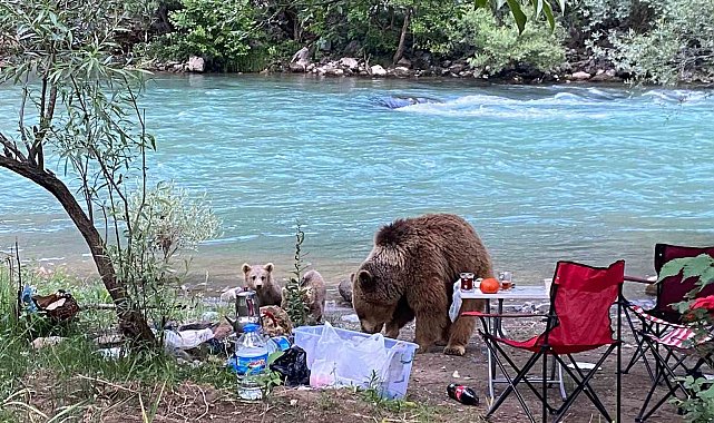 Tunceli'nin Munzur Vadisi'nde anne ayı ve yavruları piknik sofrasına konuk oldu.