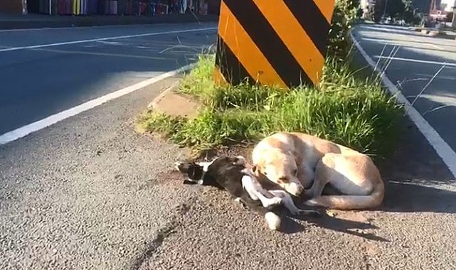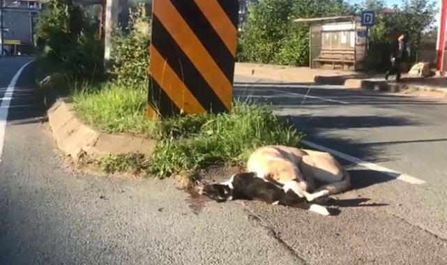 Anne köpek otomobilin çarpması ile telef olan yavrusunun başından ayrılmadı