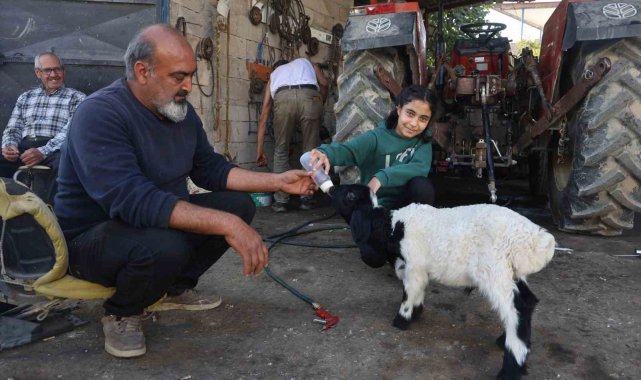 Annesi ölen kuzuyu biberonla besleyen Asu Atay, "Ben 10 yaşındayım. Küçük kuzunun adı Karabaş. Kuzuya süt ve yem veriyoruz. Biberonla süt içiriyorum. Karabaşı seviyorum" ifadelerini kullandı.