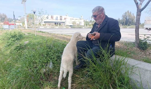 Koyunlarını Manavgat-Alanya D-400 kara yolu kıyısında bulunan boş arazilerde otlatan Hasan Kiraz'ı, yavru kuzu yol kenarında bulunan lokantaya su almaya giderken gölge gibi izliyor. Peşinden bir an olsun ayrılmayan sevimli kuzunun kendisinin koruması olduğunu söyleyen Kiraz, "Annesi 3 yavru birden doğurdu. 2 yavruyu annesi emzirirken, korumayı ben biberonla besledim. Bu süreçte yanımdan bir an bile ayrılmaz oldu. Ben nereye, koruma oraya" dedi.