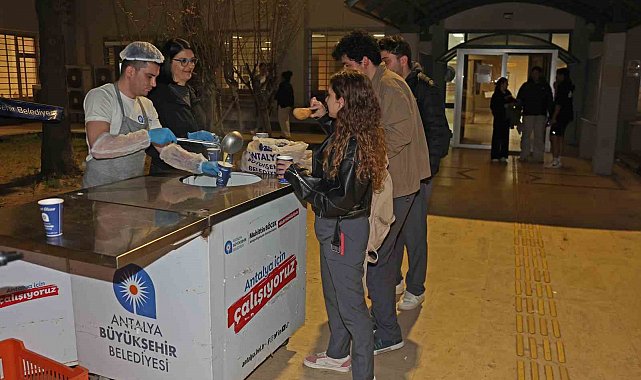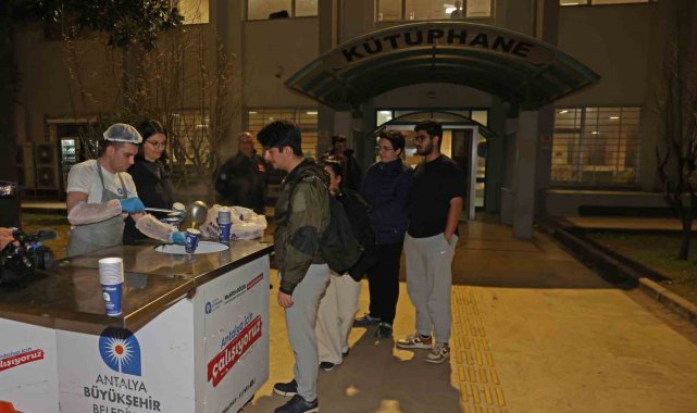 Antalya Büyükşehir Belediyesi Sosyal Yardımlar Şube Müdürlüğü ekipleri, Akdeniz Üniversitesi Merkez Kütüphanesi önünde sınav haftası boyunca saat 22.00 ile 23.00 arasında öğrencilere sıcak çorba ikramında bulunuyor. Bahar dönemi vize sınavları süresince devam edecek uygulamayla, öğrencilerin yoğun sınav temposuna moral ve destek sağlanıyor.