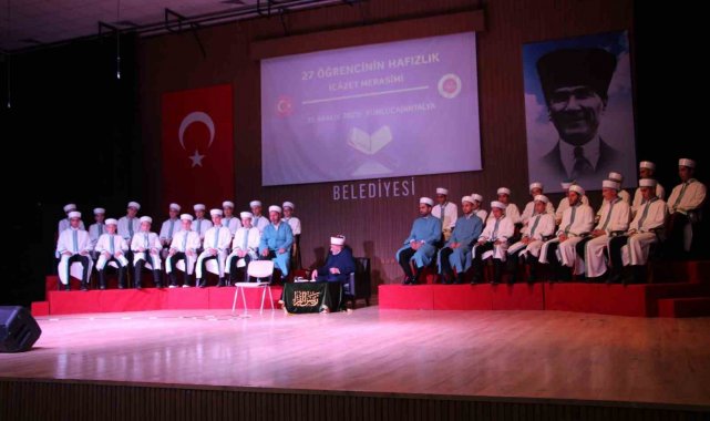 Antalya'nın Kumluca ilçesinde İlçe Müftülüğü tarafından Müftü Sadık Kavalcı Yatılı Hafızlık Erkek Kuran Kursunda eğitim gören 27 öğrenci için hafızlık icazet programı düzenlendi.