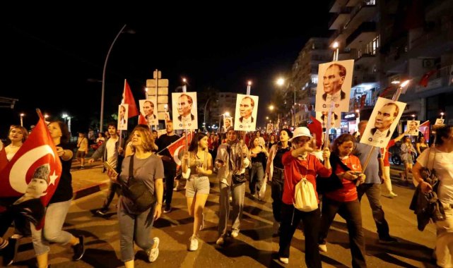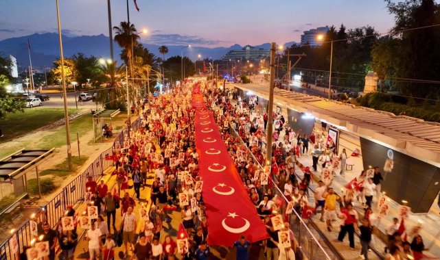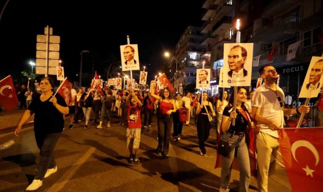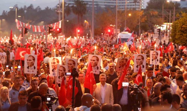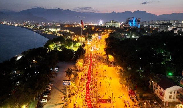 Binlerce kişi akşam saatlerinde ellerinde Türk bayrakları ve Atatürk fotoğrafları ile Fener Alayı'nın başlangıç noktası olan Konyaaltı Varyant'ta toplanmaya başladı. Antalya Valisi Hulusi Şahin, Antalya Büyükşehir Belediye Başkanı Muhittin Böcek, 3. Piyade Eğitim Tugay Komutanı Piyade Albay Hüseyin Yılmaz, Muratpaşa Kaymakamı İhsan Kara, STK temsilcileri ve çok sayıda vatandaşın katıldığı yürüyüşte 400 metrelik dev Türk bayrağı taşındı. Fener Alayı'na Türk Hava Kurumu'na bağlı paramotorcular gökyüzünden eşlik ederken, yürüyüş güzergahındaki apartmanların balkonlarındaki vatandaşlar da alkışlarıyla destekledi. 7'den 70'e binlerce Antalyalı, ellerinde Türk bayraklarıyla sloganlar ve marşlar eşliğinde Cumhuriyet Meydanı'na kadar yürüdü.