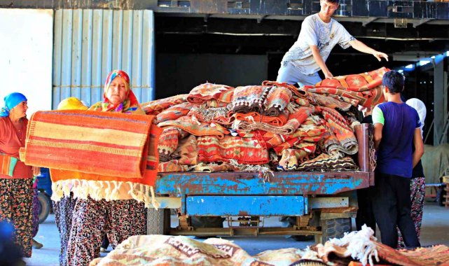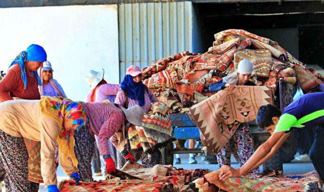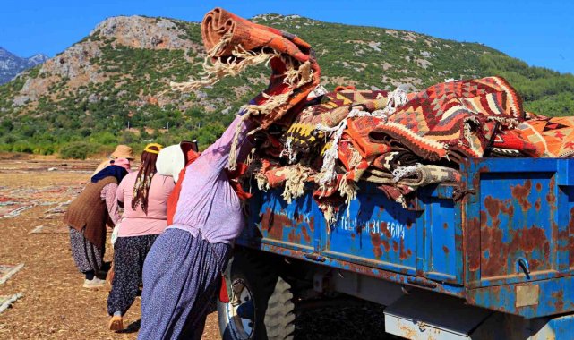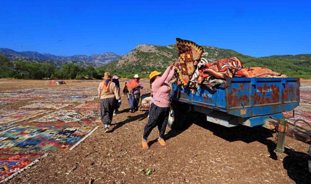 Antalya'da kışın buğday ekilen tarlalara yaz aylarında Türkiye'nin dört bir yanından getirilerek serilen binlerce el dokuması halı ve kilim renklerinin güneşle pastelleşmesinin ardından hasat edildi. Toplanan halılar depoya alınıp tozlardan arınması için yıkandıktan sonra müşterilere teslim ediliyor.