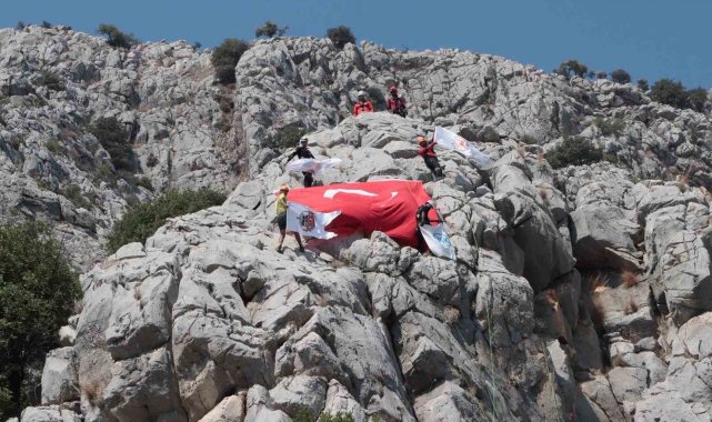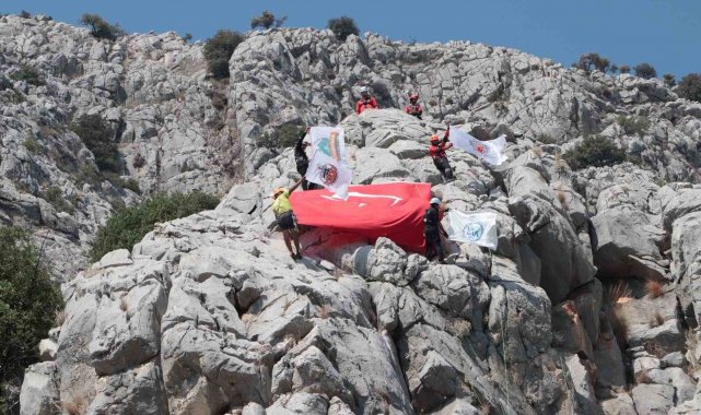 Antalya'da 30 Ağustos Zafer Bayramı'nın 103. yılı anısına Kızlar Sivrisi Dağı'na tırmanan dağcılar, zirvede dev Türk bayrağı açtı.