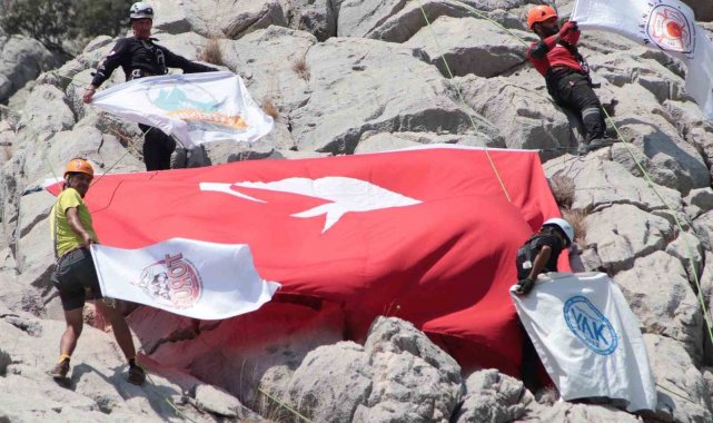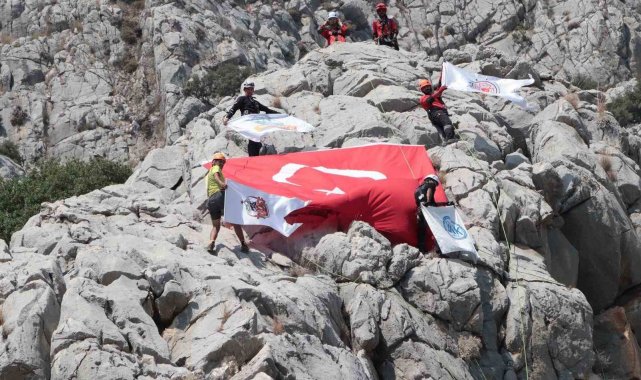 Antalya'da dağcılar Zafer Bayramı'na özel Türk bayrağı açtı