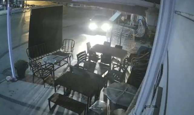 Antalya'nın Serik ilçesinde internet dağıtım panosuna çarpan otomobil, bir iş yerinin önündeki masa ve sandalyelere de zarar verdi. Sürücü olay yerinden uzaklaşırken, kaza anı güvenlik kameralarına yansıdı.