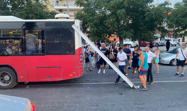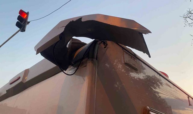 Antalya'nın Aksu ilçesinde Büyükşehir Belediyesine ait halk otobüsüne durağa yanaştığı sıra arkasından gelen karavanın tentesi saplandı.