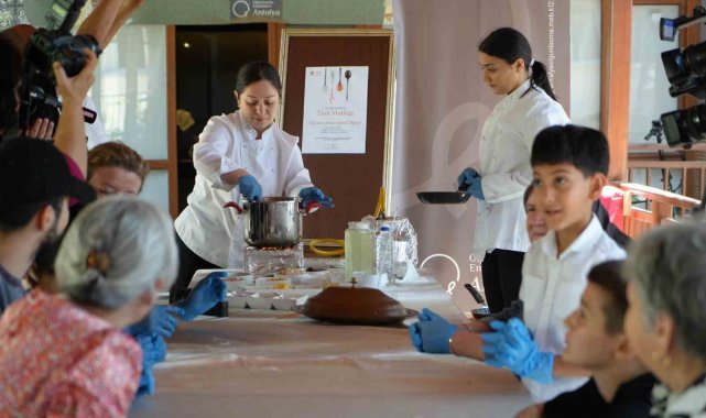 Antalya'da düzenlenen Türk Mutfağı Haftası etkinliğinde büyükanneler, torunlarıyla birlikte coğrafi işaretli gülüklü (hülüklü) çorbası hazırladı.