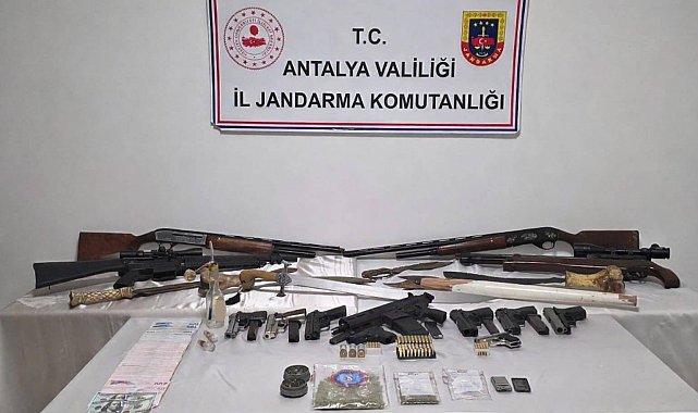 Cumhuriyet Başsavcılığının talimatları doğrultusunda uyuşturucuyla mücadele kapsamında Antalya İl Jandarma Komutanlığı ekiplerince yürütülen çalışmalarda Konyaaltı ilçesinde 1 şüpheli şahsın ikametinde arama yapıldı. Jandarma ekiplerince yapılan aramada, ikamet içerisinde 8 adet ruhsatsız tabanca ve şarjörü, 150 adet tabanca fişeği, 3 adet av tüfeği, 2 adet havalı tüfek, 2 adet kılıç, 4 adet pala olarak tabir edilen bıçak, 102 gram kubar esrar, 5 gram metamfetamin, 3 adet uyuşturucu kullanma aparatı, 1 adet esrar öğütme aparatı, 1 adet hassas terazi ile suçtan elde edildiği değerlendirilen para ele geçirildi. Olayla ilgili olarak şüpheli şahıs hakkında Jandarma ekipleri tarafından adli tahkikat başlatıldı.
