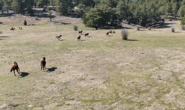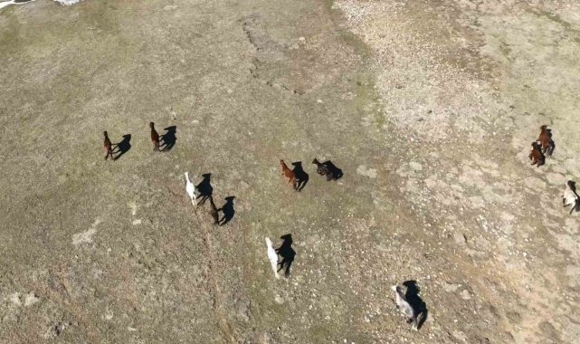 Antalya Büyükşehir Belediyesi, İbradı ilçesine bağlı Eynif Merası'nda 90 bin dönümlük alanda yaşamlarını sürdüren yılkı atları için soğuk kış günlerinde beslenmelerini sağlamak amacıyla saman ve yonca balyası bıraktı. Yılkı atlarının o görüntüleri dron kamerasına yansıdı.