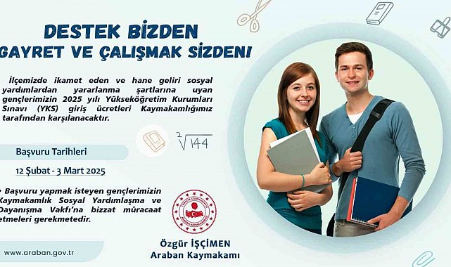 Araban Kaymakamı Özgür İşçimen, ilçede Yükseköğretim Kurumları Sınavı'na girecek ihtiyaç sahibi öğrencilerin başvuru ücretinin kaymakamlık tarafından karşılanacağını açıkladı. Konu ile ilgili açıklama yapan İşçimen, "İlçemizde ikamet eden ve hane geliri sosyal yardımlardan yararlanma şartlarına uyan gençlerimizin 2025 yılı Yükseköğretim Kurumları Sınavı (YKS) giriş ücreti kaymakamlığımız tarafından karşılanacaktır. Başvuru yapmak isteyen gençlerimizin kaymakamlık Sosyal Yardımlaşma ve Dayanışma Vakfı'na bizzat müracaat etmeleri gerekmektedir" ifadelerini kullandı.