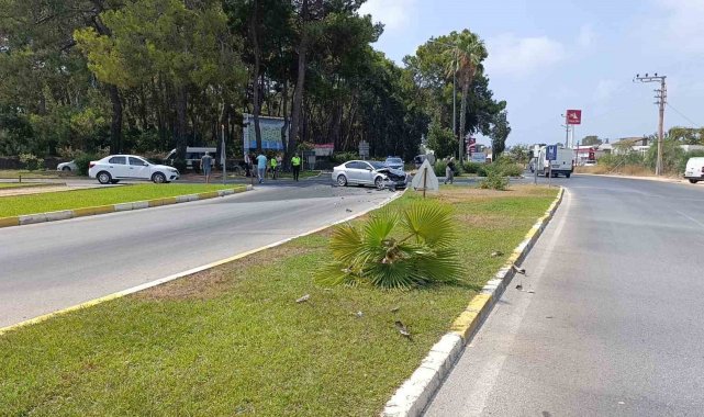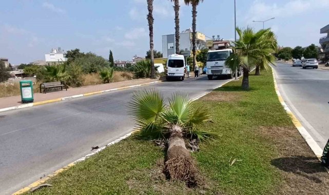 Çarpışmanın şiddetiyle kontrolünü kaybeden tur minibüsü, refüjdeki palmiyeyi devirerek karşı şeride geçti ve kaldırımdaki bir başka palmiyeye çarparak durabildi.
