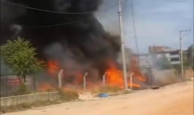 Bursa'nın İnegöl ilçesinde faaliyet gösteren araç denetim istasyonu yanındaki atıl malzemeler alev alev yandı.