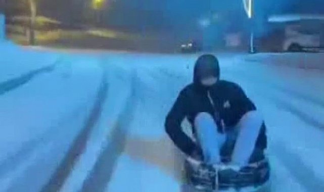Aracın arkasına lastik bağlayıp oturdu, karda kayıp kayıt aldırdı