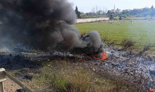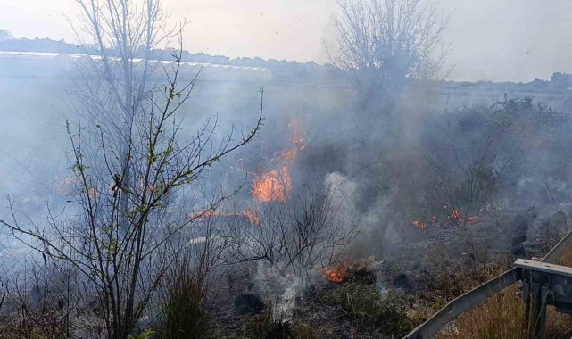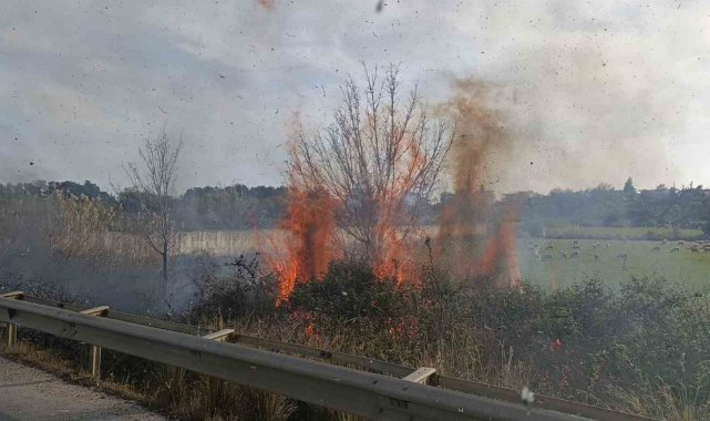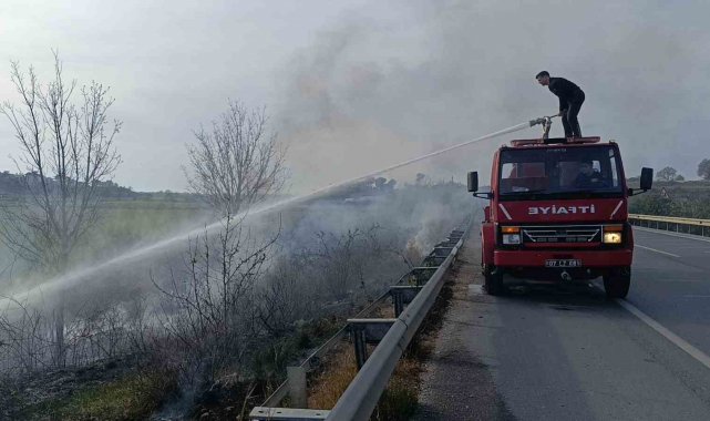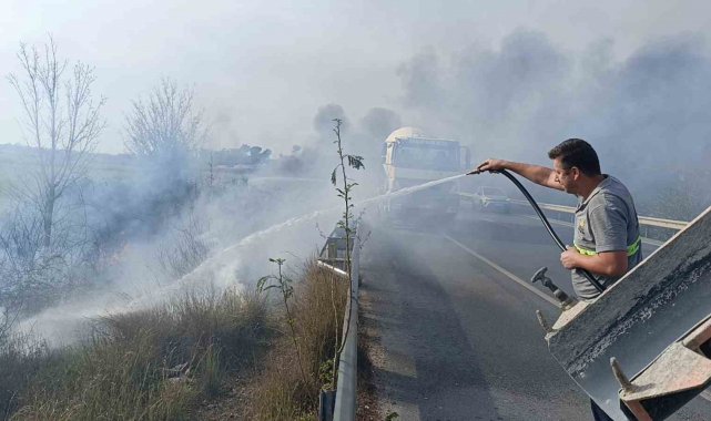 Araçtan atılan sigara yol kenarında yangın çıkardı, ilk müdahale beton mikserinden geldi