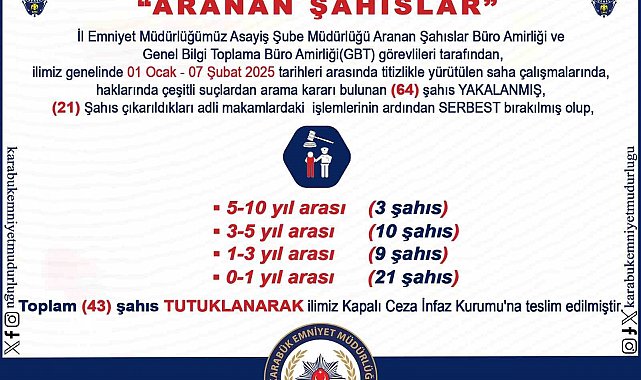 Karabük İl Emniyet Müdürlüğü Asayiş Şube Müdürlüğü Aranan Şahıslar Büro Amirliği ve Genel Bilgi Toplama Büro Amirliği (GBT) ekipleri tarafından il genelinde 1 Ocak - 7 Şubat tarihleri arasında yapılan saha çalışmalarında, haklarında çeşitli suçlardan aramaları bulunan 64 şahıs yakalandı. Yakalanan şahıslardan 21'i tamamlanan işlemlerinin ardından serbest bırakıldı. 0-1 yıl arası aranması olan 21 şahıs, 1-3 yıl arası 9 şahıs, 3-5 yıl arası aranması olan 10 şahıs, 5-10 yıl arası aranması olan 3 şahıs olmak üzere toplam 43 şahıs tamamlanan işlemlerinin ardından tutuklanarak Karabük Ceza İnfaz Kurumuna teslim edildi.