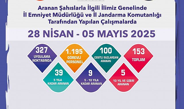 Edinilen bilgilere göre, İl Emniyet Müdürlüğü ve İl Jandarma Komutanlığı ekiplerinin aranan şahıslarla ilgili çalışmaları sürüyor. Bu çerçevede, 28 Nisan - 5 Mayıs tarihleri arasında 327 uygulama noktasında bin 195 görevli personel ile çalışma yapıldı. Ekiplerin çalışmaları sonucunda; çeşitli suçlardan aranan 100 şahıs, 5 yıla kadar aranan 39 şahıs, 5 ila 10 yıla kadar aranan 9 şahıs ile 10 yıl ve üzeri aranan 5 şahıs olmak üzere toplam 153 şahıs yakalandı.