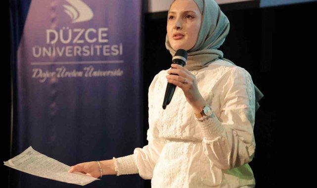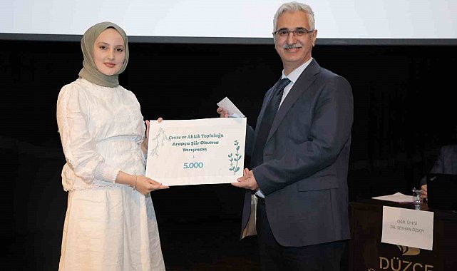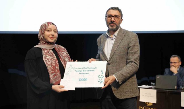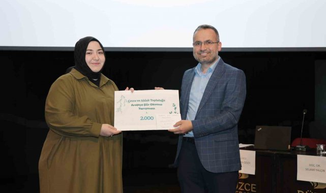 Düzce Üniversitesi İlahiyat Fakültesi ile Çevre ve Ahlak Topluluğu iş birliğiyle düzenlenen Arapça Şiir Okuma Yarışması'nda birinci olan Havvanur Çalışkan'a 5 bin TL ödül verildi.
