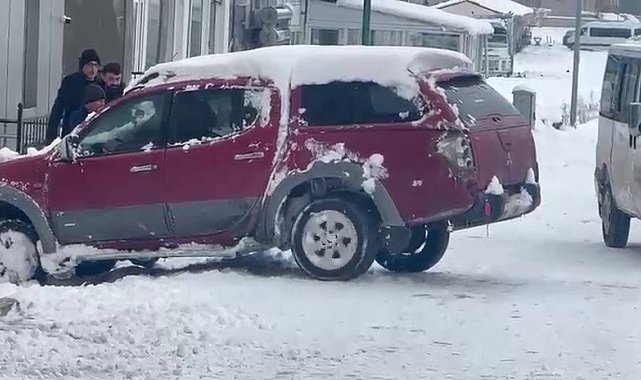Ardahan'ın Çıldır ilçesinde yoğun kar yağışı sonrası oluşan buzlanma nedeniyle araçlar yolda kaldı.