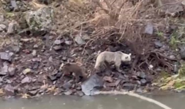 Ardahan'ın Çıldır ilçesinde Kura nehri kenarına inen boz ayı ve yavruları, vatandaşlar tarafından görüntülendi.