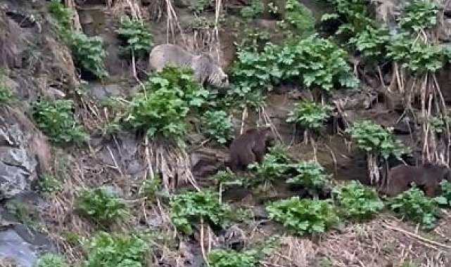 Görüntülerde, nehir kenarında yavrularıyla dolaşan ayı daha sonra kayalıklardan tırmanarak ilerlediği görüldü.
