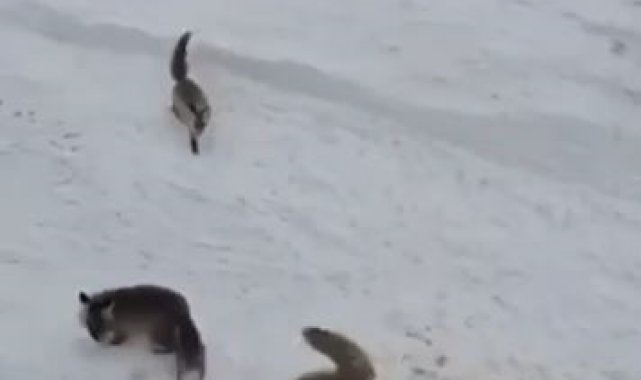 Ardahan'da karlı arazide av arayan tilkiler, Karayolları ekipleri tarafından ekmekle beslendi. Tilkiler arasında yaşanan ekmek kapma mücadelesi ise kameraya saniye saniye yansıdı.