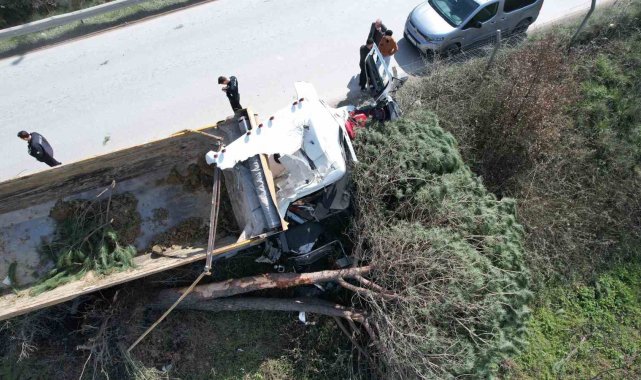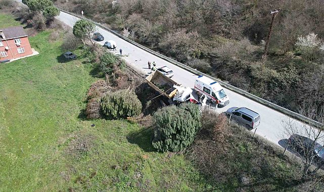 Arnavutköy'de hafriyat kamyonu çayırlık alana uçtu, ağaçların devrildiği alan havadan görüntülendi