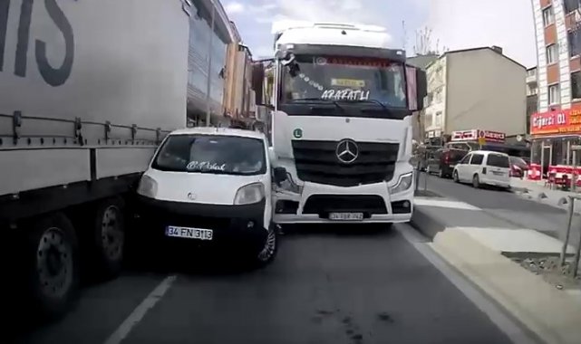 Arnavutköy'de hafif ticari araç, sağ şeritte park halindeki araçlar nedeniyle sol şeride geçmek istedi. Bu sırada sol şeritteki tırın şoförü, kör noktada kalan araca çarptı. Hafif ticari araç, bir müddet sürüklendikten sonra çarpan tır ile yol kenarında park halindeki tır arasında sıkıştı. Araçlarda hasara yol açan kazada yaralanan olmadı. Kaza anı, bir otomobilin araç içi kamerasınca kaydedildi.