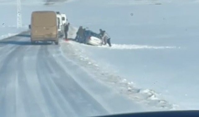 Edinilen bilgilere göre, yoğun kar ve buzlanma nedeniyle kontrolden çıkan araç yol kenarında kara saplandı. Durumu fark eden köylüler hemen harekete geçerek minibüs yardımıyla aracı bulunduğu yerden çekti.