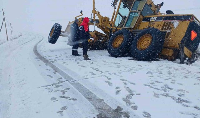Arpalı'da karla mücadele sırasında iş makinesi kara saplandı