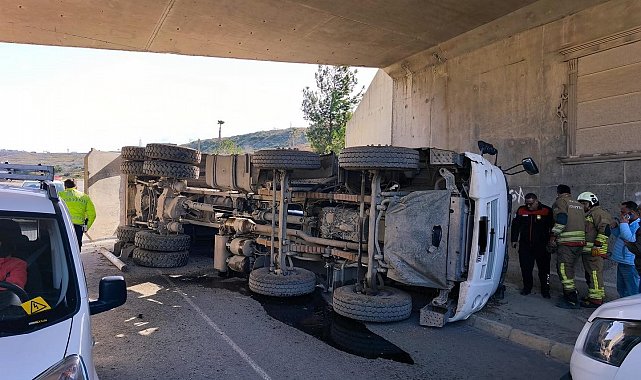 Hatay'da sürücüsünün kontrolünü kaybetmesiyle devrilen hafriyat kamyonun sürücüsü yaralandı.