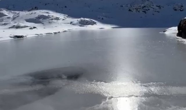 Bölgede kar yağışının başlamasıyla birlikte yolu kapanan tabiat parkına ulaşan 3 adrenalin tutkunu gezgin, karla kaplanan zirveleri ve donan gölleri görüntüleyerek doğanın kış güzelliğini kayıt altına aldı.