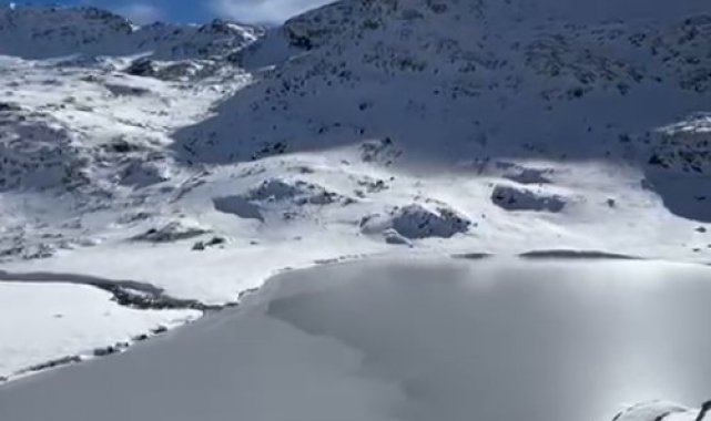 Türkiye'nin en etkileyici dağ manzaralarından birine sahip olan ve büyüleyici doğal güzelliğiyle bilinen Artabel Gölleri Tabiat Parkı, yaz aylarında kristal berraklığındaki 22 gölüyle ziyaretçilerini ağırlarken, kar yağışının ardından beyaza bürünerek eşsiz bir kış manzarası sundu.
