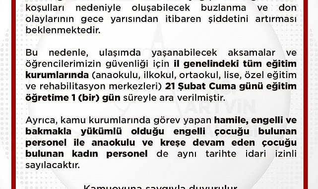 Artvin Valiliğinden yapılan açıklamada, il genelinde etkili olan kar yağışı ile birlikte oluşabilecek don ve buzlanmanın gece yarısından itibaren şiddetini artırmasının beklendiği ifade edilerek, "Öğrencilerimizin güvenliği için il genelindeki tüm eğitim kurumlarında (anaokulu, ilkokul, ortaokul, lise, özel eğitim ve rehabilitasyon merkezleri) 21 Şubat Cuma günü eğitim öğretime 1 gün süreyle ara verilmiştir" ifadeleri kullanıldı.