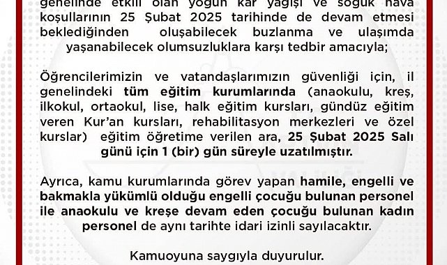 Meteoroloji İl Müdürlüğü'nden alınan verilere göre Artvin'de etkili olan yoğun kar yağışı ve soğuk havanın 25 Şubat Salı günü de devam etmesi beklenirken, Artvin Valiliği eğitim öğretime 1 gün daha ara verildiğini duyurdu. Valilikten yapılan yazılı açıklamada, Salı günü il genelindeki tüm eğitim kurumlarında (anaokulu, kreş, ilkokul, ortaokul, lise, halk eğitim kursları, gündüz eğitim veren Kur'an kursları, rehabilitasyon merkezleri ve özel kurslar) eğitim öğretime verilen aranın 1 gün süreyle uzatıldığı belirtildi. Ayrıca kamu kurumlarında görev yapan hamile, engelli ve bakmakla yükümlü olduğu engelli çocuğu bulunan personel ile anaokulu ve kreşe devam eden çocuğu bulunan kadın personelin de aynı tarihte idari izinli sayılacağı kaydedildi.