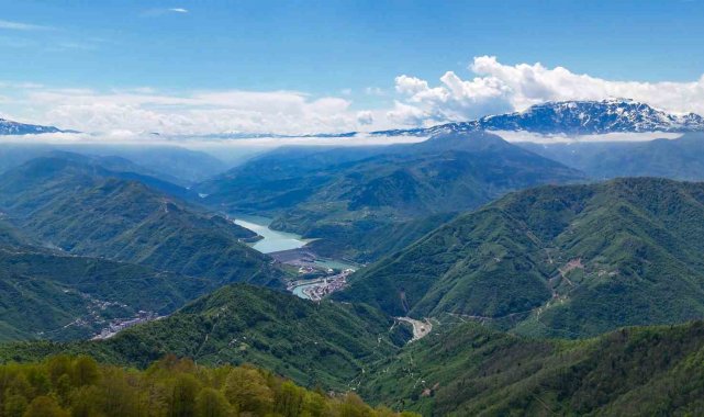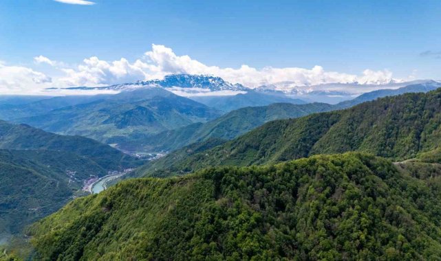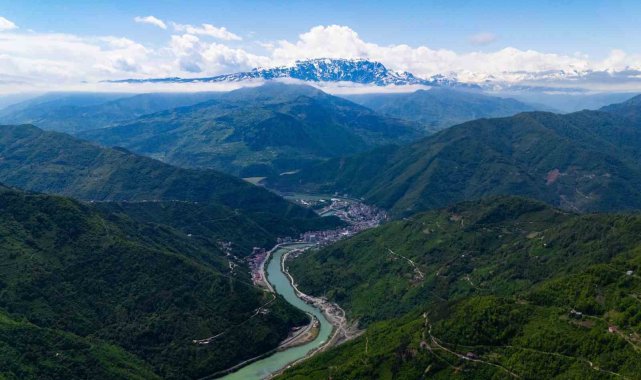Artvin'in yüksek kesimlerinde kar etkisini sürdürürken, vadilerde ilkbaharın gelişiyle birlikte doğa adeta yeniden canlandı. Karlı dağlar ve yeşeren ormanlar havadan görüntülendi.