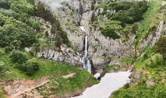 Artvin'in Şavşat ilçesindeki Bazgiret Şelalesi, karların erimesiyle birlikte coşarak ziyaretçileri kendine hayran bırakıyor.