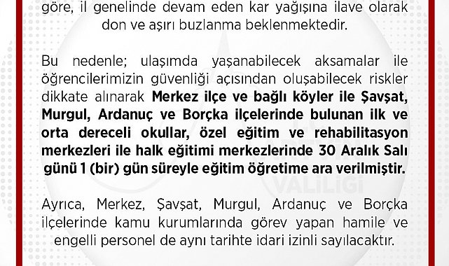 Artvin Valiliği'nden yapılan açıklamada, Meteoroloji İl Müdürlüğü'nden alınan değerlendirmelere göre il genelinde devam eden kar yağışına ilave olarak don ve aşırı buzlanma beklendiği belirtildi. Ulaşımda yaşanabilecek aksamalar ile öğrencilerin güvenliği göz önünde bulundurularak; Artvin merkez ilçe ve bağlı köyler ile Şavşat, Murgul, Ardanuç ve Borçka ilçelerinde bulunan ilk ve orta dereceli okullar, özel eğitim ve rehabilitasyon merkezleri ile halk eğitim merkezlerinde 30 Aralık Salı günü eğitim öğretime bir gün süreyle ara verildi.