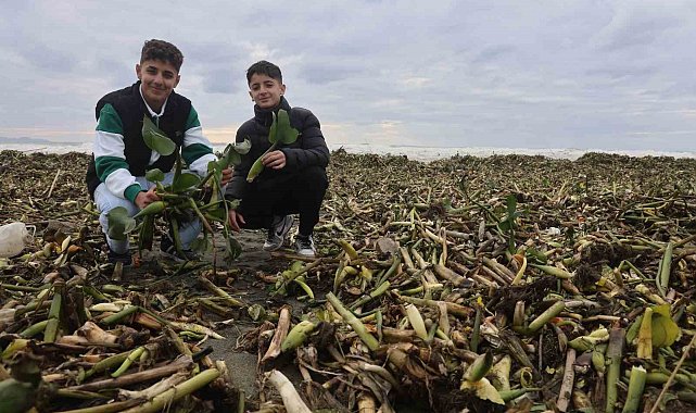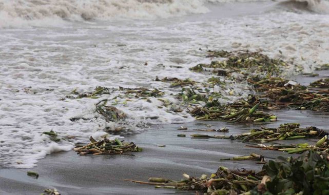 Hatay'da yaz aylarında Asi Nehrin kaplayan istilacı su sümbülleri, kentte etkili olan şiddetli fırtına ve yağışla birlikte Akdeniz'e döküldü. Denizdeki dalgaların kıyıya vurduğu su sümbülleri, Samandağ sahilini yeşile büründü.