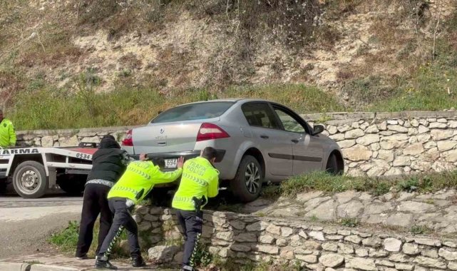 Karabük'ün Safranbolu ilçesinde duvarda asılı kalan otomobili alt yola düşmekten polis ekipleri kurtardı.