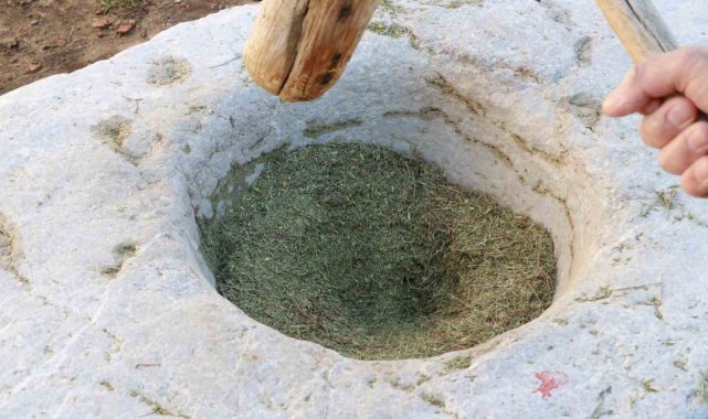 Hadim ilçesi Gezlevi Mahallesi'ndeki asırlık dibek, özellikle kekik, buğday ve mısır gibi ürünlerin işlenmesinde tercih ediliyor. Teknolojinin gelişmesine rağmen eski yöntemlerden vazgeçmeyen mahalle sakinleri, atalarından kalan mirası korumayı sürdürüyor. 62 yaşındaki Meryem Sevinç, dibekle çocukluğundan bu yana iç içe olduğunu belirterek, "Bu dibek 300 seneden fazladır burada. Köyde herkes bir şey dövmek için buraya gelir. Ortak kullanılan bir dibek" dedi.