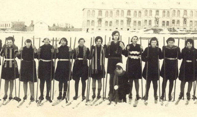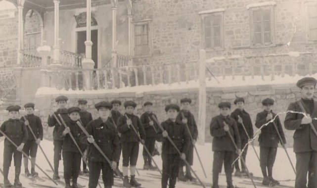 Erzurum Reşit Karabacak Spor Lisesi öğrencileri, 110 yıl önce çekilen iki kare fotoğraftan yola çıkarak o dönemin kıyafetleri ve kayak malzemeleri ile kayak yaptılar.