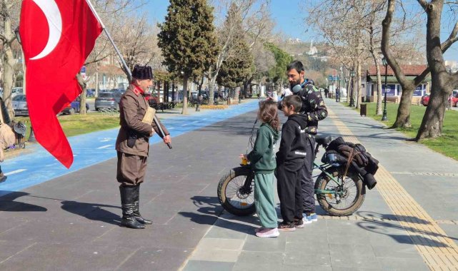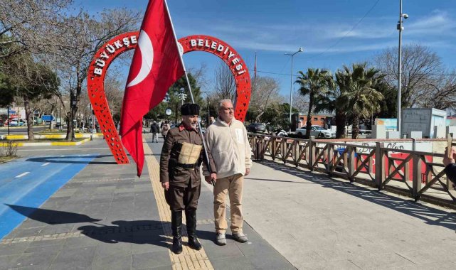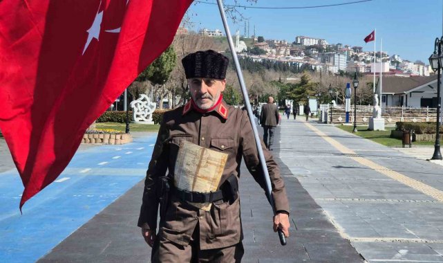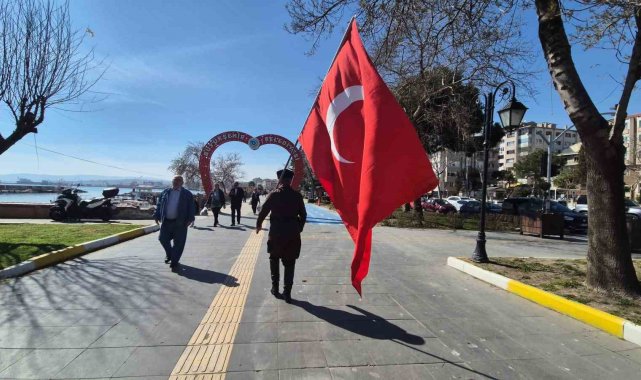 Askeri kıyafeti ve elinde Türk bayrağıyla İstanbul'dan Çanakkale'ye yürüyor