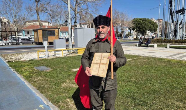 Çanakkale Savaşı gazisinin torunu Saffet Gümüş, giydiği tarihi üniforma ve elinde Türk bayrağıyla İstanbul'dan Çanakkale'ye yürüyerek zaferin 110'uncu yılında atalarına vefa gösteriyor.
