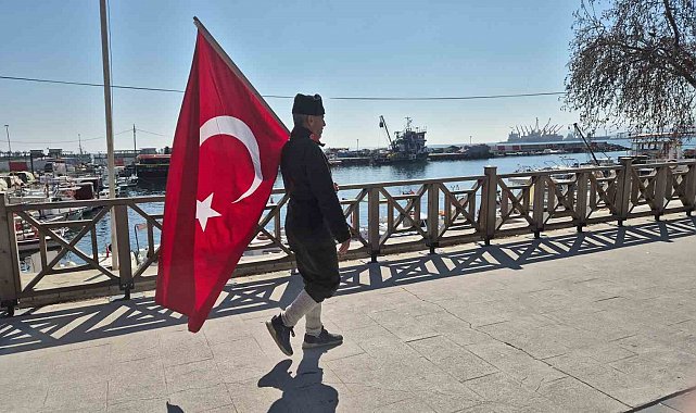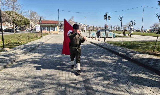 Askeri üniforma ve bayrakla İstanbul'dan Çanakkale'ye yürüyor