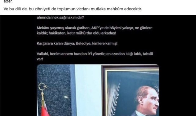 Öte yandan, İYİ Partili Mehmet Emin Korkmaz'ın Eskişehir Mihalgazi Belediye Başkanı Zeynep Güneş'e yönelik paylaşımı gündem olmuştu. Güneş'e kıyafeti üzerinden hakaret eden Korkmaz, savcılık talimatı üzerine gözaltına alınıp, tutuklanarak cezaevine gönderildi.