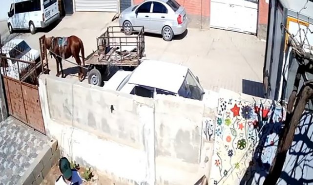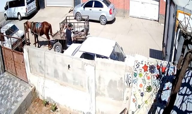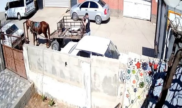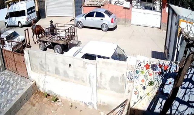 Hatay'ın Reyhanlı ilçesinde at arabasıyla gelen şahsın evin bahçesinde bulunan demir korkuluğu alarak uzaklaştığı anlar güvenlik kamerasına yansıdı.