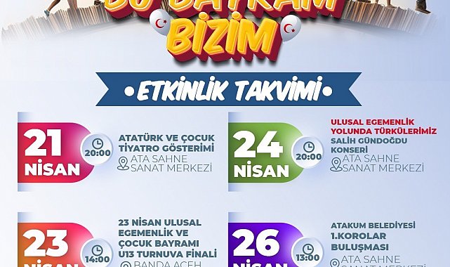 SAMSUN (İHA) – Samsun'un Atakum Belediyesi, 23 Nisan Ulusal Egemenlik Çocuk Bayramı ile Türkiye Büyük Millet Meclisinin 106. kuruluş yıl dönümünü tiyatro gösteriminden konsere ve spor turnuvalarına birbirinden özel etkinliklerin yer aldığı özel programla kutlayacak.